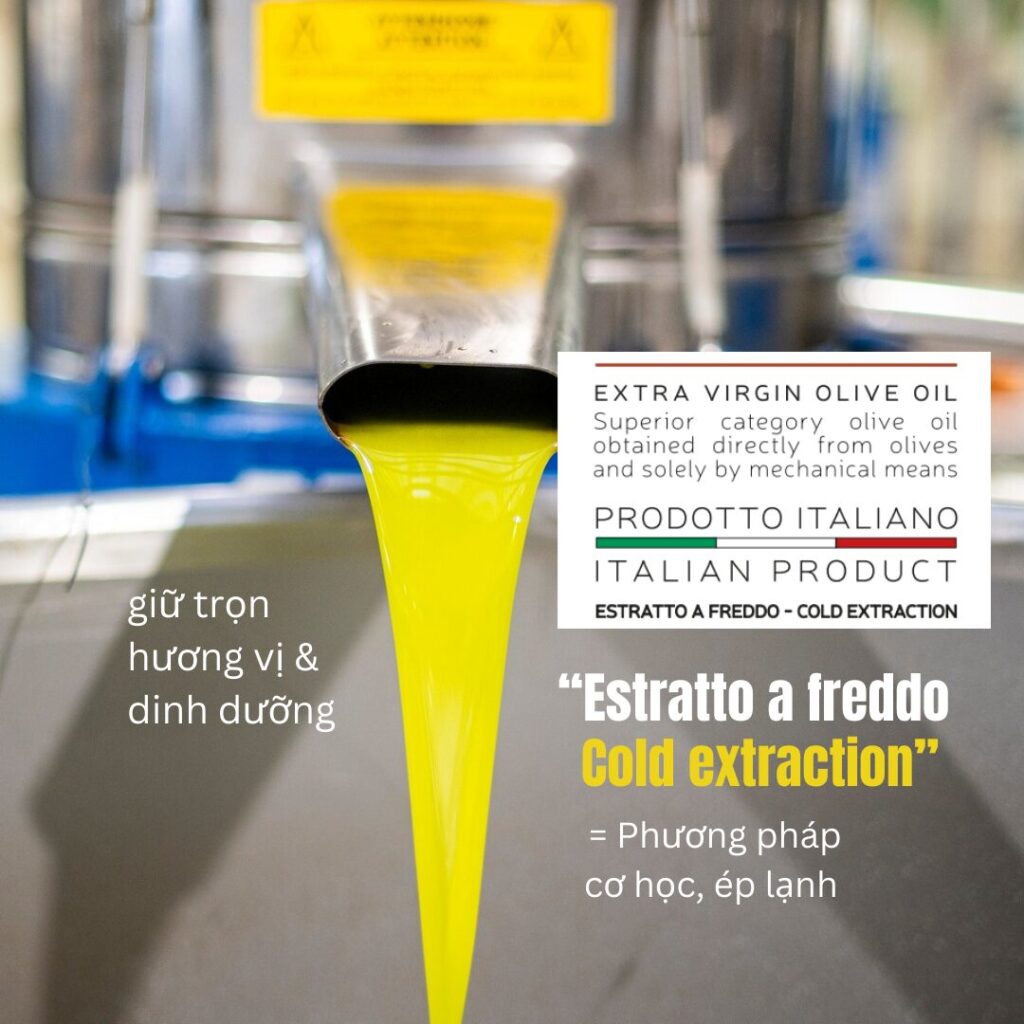 Extra Virgin Olive Oil (EVOO) là loại dầu cao cấp nhất, được chiết xuất 100% bằng phương pháp cơ học ở nhiệt độ không quá 27°C, không qua tinh luyện hóa học, và có độ axit tự do ≤ 0,8%. Điều này giúp bảo toàn hương vị tươi mát, các hợp chất chống oxy hóa và dưỡng chất tự nhiên. Trên nhãn, bạn sẽ thấy cụm “Extra Virgin” đi kèm các thông tin như Cold Pressed hoặc First Cold Press – nghĩa là dầu được ép lạnh từ lần đầu tiên, giữ trọn hương vị và dưỡng chất. Nếu không thấy những cụm này, rất có thể đó không phải EVOO thực sự.