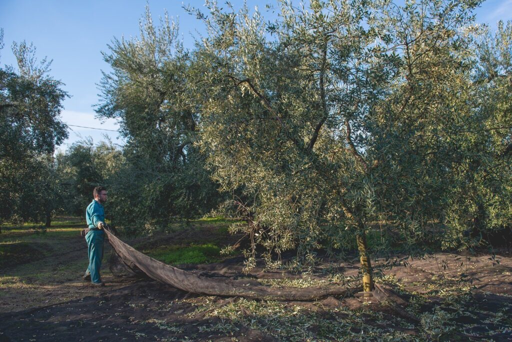 Từ tháng 10 đến tháng 11, khi trái oliu đạt độ chín lý tưởng, mùa thu hoạch bắt đầu – đó cũng là thời khắc quan trọng nhất để tạo nên dầu Extra Virgin chất lượng. Người nông dân Guglielmi vẫn giữ thói quen truyền thống: xen kẽ thu hoạch thủ công bằng “lược chải quả” – một dụng cụ nhẹ nhàng luồn qua cành để gỡ từng trái oliu, với kỹ thuật cơ học bằng lược rung giúp rút ngắn thời gian nhưng không làm mất đi sự tinh tế. Quả oliu sau đó rơi xuống tấm bạt trải dưới gốc cây, được thu gom và lựa chọn ngay tại chỗ.