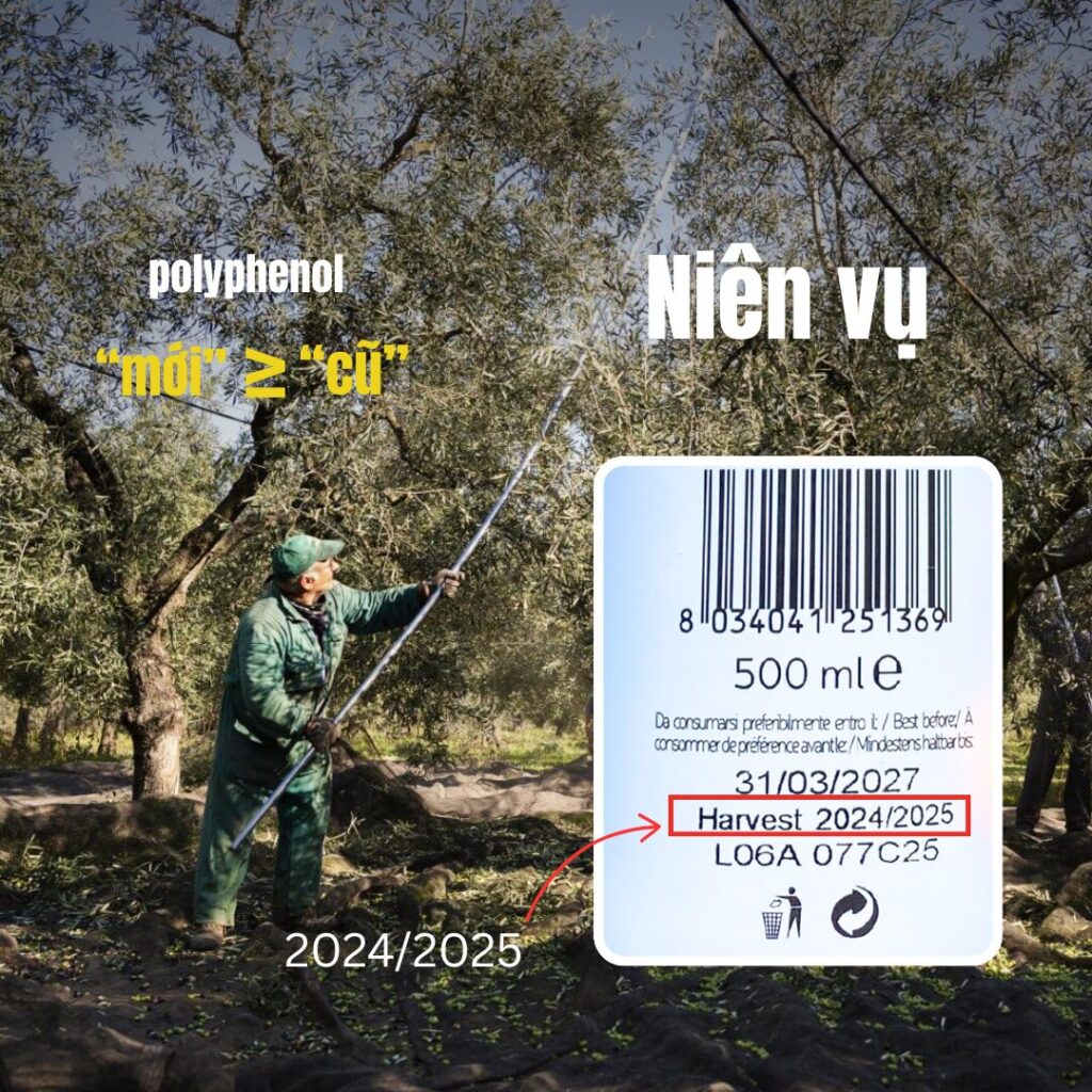 Thông tin về thời điểm thu hoạch (harvest) thường được ghi theo dạng hai năm liên tiếp. Vì dầu oliu được sản xuất vào những tháng cuối năm (tháng 11, 12) , nên trên nhãn phải thể hiện cả năm hiện tại và năm kế tiếp (ví dụ: mùa vụ 2024/2025).